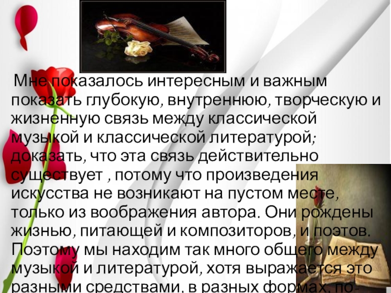и жизненную связь между классической музыкой и классической литературой; доказать, что эта связь действительно существует , потому что произведения искусства не возникают на пустом месте, только из воображения автора. Они рождены жизнью, питающей и композиторов, и поэтов. Поэтому мы находим так много общего между музыкой и литературой, хотя выражается это разными средствами, в разных формах, по-разному воздействуя на нас.