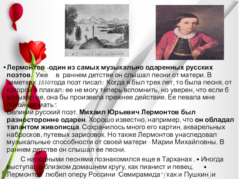 С народными песнями познакомился еще в Тарханах .• Иногда выступал в близком домашнем кругу, как пианист и певец. • Лермонтов любил оперу Россини "Семирамида" ( как и Пушкин) и охотно участвовал в исполнении дуэтов из этой оперы. • По свидетельству современников, Михаил Юрьевич " очень хорошо пел романсы- то есть не пел, а говорил их почти речитативом"