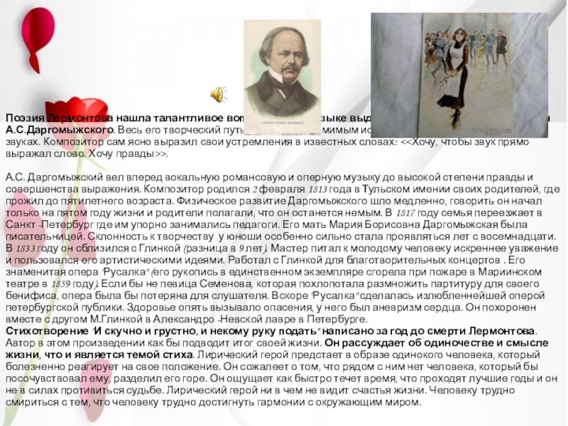 Слайд 19Поэзия Лермонтова нашла талантливое воплощение в музыке выдающегося русского композитора А.С.Даргомыжского.