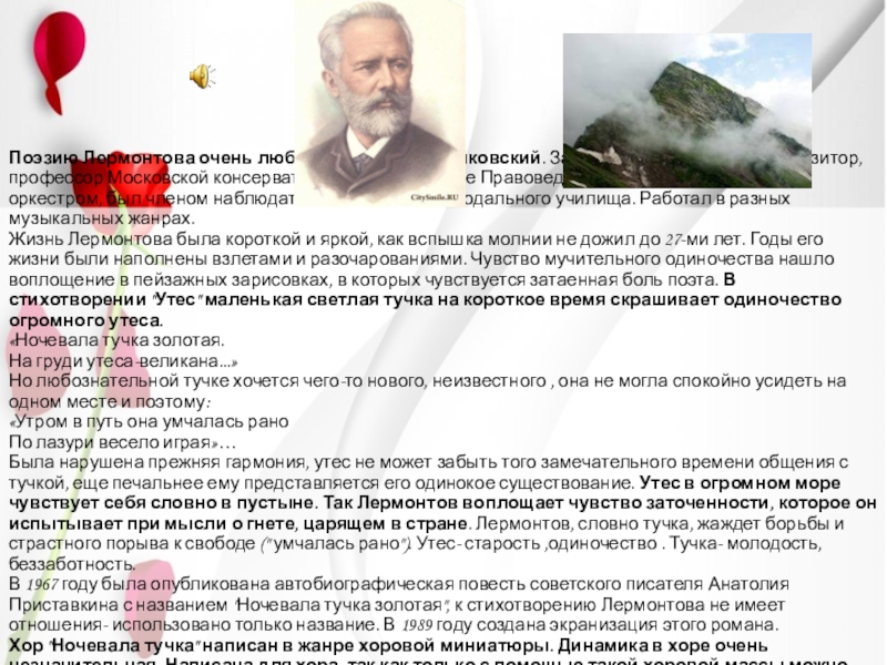 Слайд 22Поэзию Лермонтова очень любил и ценил П.И.Чайковский. Замечательный русский композитор, профессор