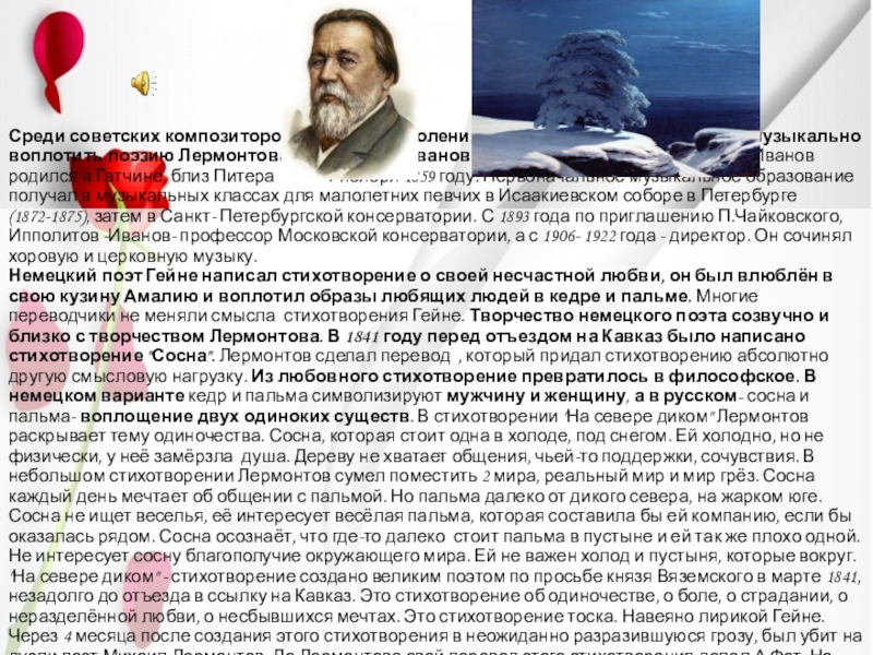 поэзию Лермонтова- Ипполитов-Иванов. Михаил Михайлович Ипполитов Иванов родился в Гатчине, близ Питера 7 ноября 1859 году. Первоначальное музыкальное образование получал в музыкальных классах для малолетних певчих в Исаакиевском соборе в Петербурге (1872-1875), затем в Санкт- Петербургской консерватории. С 1893 года по приглашению П.Чайковского, Ипполитов -Иванов- профессор Московской консерватории, а с 1906- 1922 года - директор. Он сочинял хоровую и церковную музыку.
