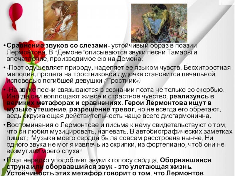 -На звуке песни связываются в сознании поэта не только со скорбью. Иногда они воплощают живое и страстное чувство, реализуясь в великих метафорах и сравнениях. Герои Лермонтова ищут в музыке утешение, разрешение тревог, но не всегда его обретают, ведь окружающая действительность чаще всего дисгармонична.