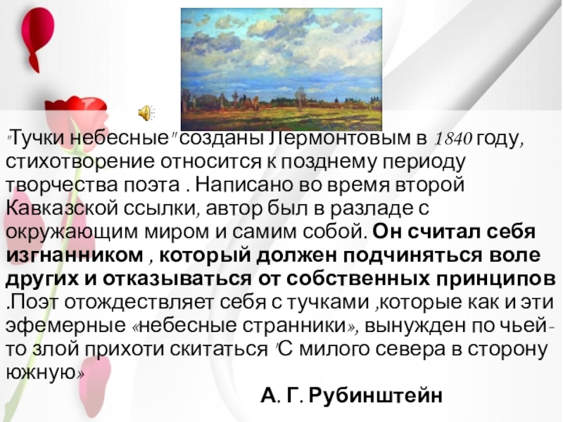 Слайд 15"Тучки небесные" созданы Лермонтовым в 1840 году, стихотворение относится к позднему