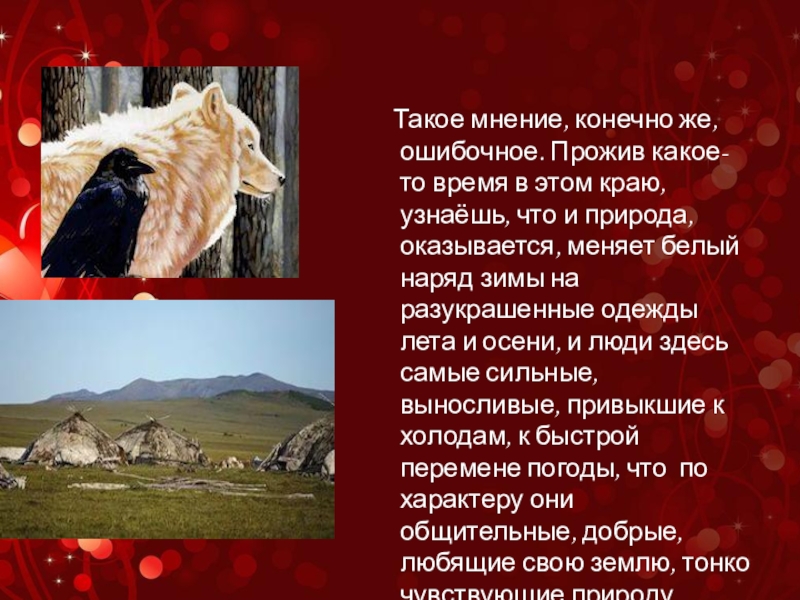 этом краю, узнаёшь, что и природа, оказывается, меняет белый наряд зимы на разукрашенные одежды лета и осени, и люди здесь самые сильные, выносливые, привыкшие к холодам, к быстрой перемене погоды, что по характеру они общительные, добрые, любящие свою землю, тонко чувствующие природу.