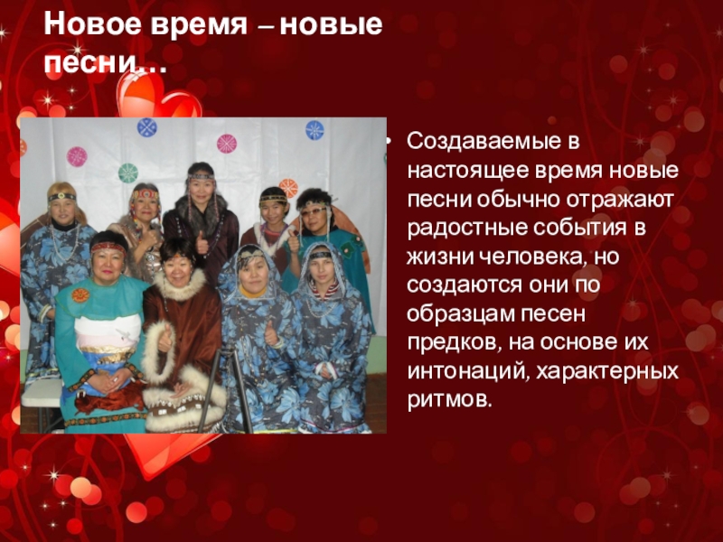 отражают радостные события в жизни человека, но создаются они по образцам песен предков, на основе их интонаций, характерных ритмов.