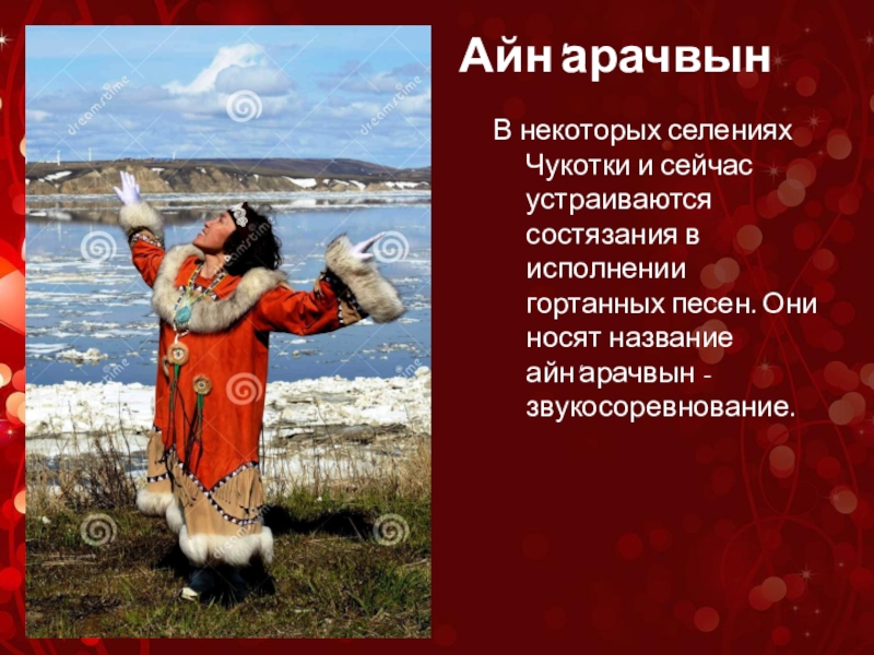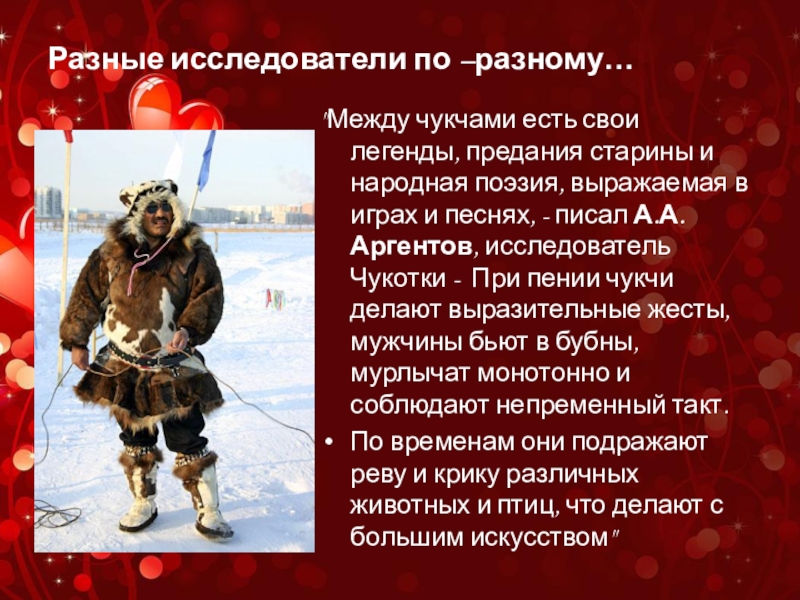 народная поэзия, выражаемая в играх и песнях, - писал А.А. Аргентов, исследователь Чукотки - При пении чукчи делают выразительные жесты, мужчины бьют в бубны, мурлычат монотонно и соблюдают непременный такт.