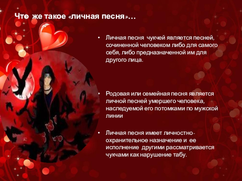 . В этом отношении личные песни имеют характер наследственных песен, стоящих в одном ряду со священными семейными предметами — семейными реликвиями.