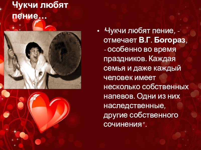 "Чукчи любят пение, - отмечает В.Г. Богораз, - особенно во