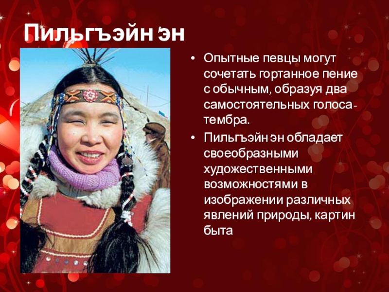 Пильгъэйн'эн обладает своеобразными художественными возможностями в изображении различных явлений природы, картин быта