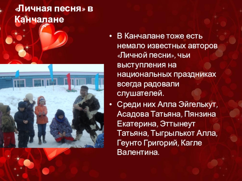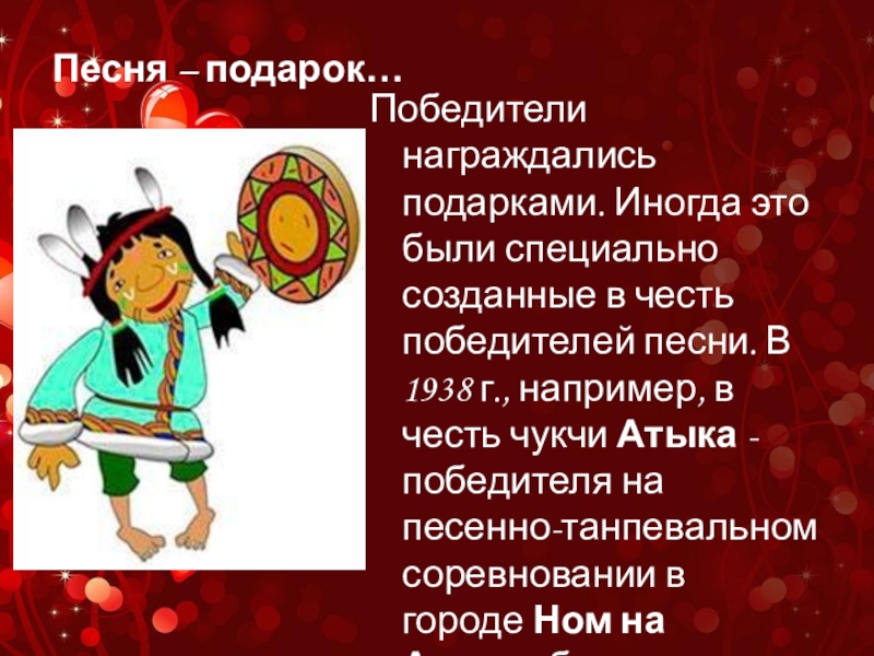 честь победителей песни. В 1938 г., например, в честь чукчи Атыка - победителя на песенно-танпевальном соревновании в городе Ном на Аляске была создана песня-подарок от эскимосов Аляски.