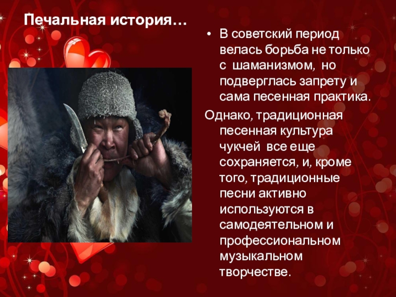 Однако, традиционная песенная культура чукчей все еще сохраняется, и, кроме того, традиционные песни активно используются в самодеятельном и профессиональном музыкальном творчестве.
