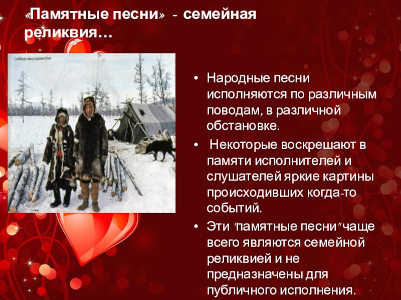 Эти "памятные песни" чаще всего являются семейной реликвией и не предназначены для публичного исполнения.