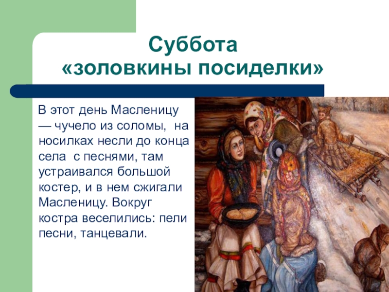 В этот день Масленицу — чучело из соломы, на носилках несли до конца села с песнями, там устраивался большой костер, и в нем сжигали Масленицу. Вокруг костра веселились: пели песни, танцевали.