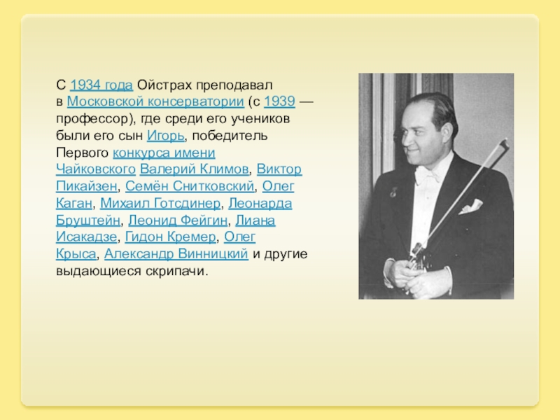 Слайд 20С 1934 года Ойстрах преподавал в Московской консерватории (с 1939 — профессор), где среди его учеников были