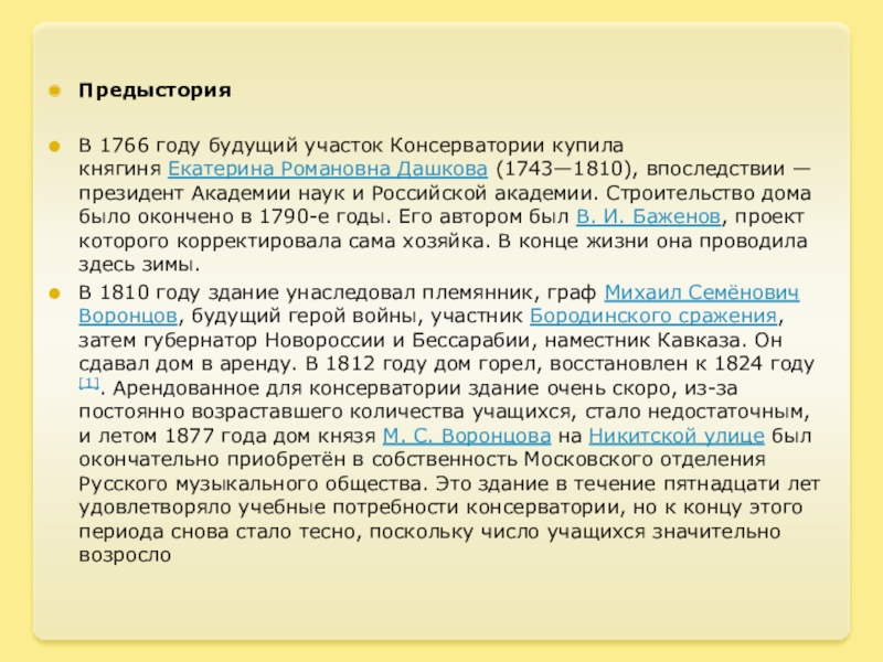 В 1766 году будущий участок Консерватории купила княгиня Екатерина Романовна Дашкова (1743—1810), впоследствии —