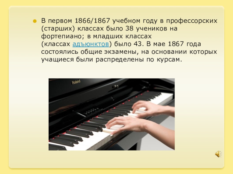 учеников на фортепиано; в младших классах (классах адъюнктов) было 43. В мае 1867 года состоялись общие экзамены, на основании которых учащиеся были распределены по курсам.