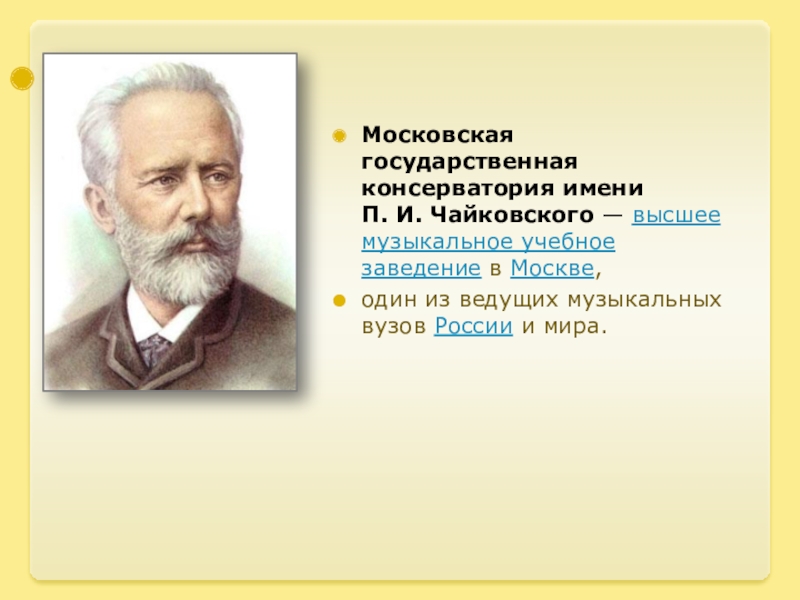 Московская государственная консерватория имени П. И. Чайковского — высшее музыкальное учебное заведение в Москве,