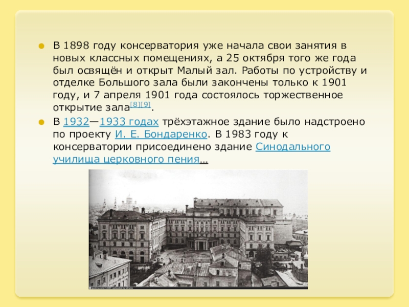Слайд 9В 1898 году консерватория уже начала свои занятия в новых классных