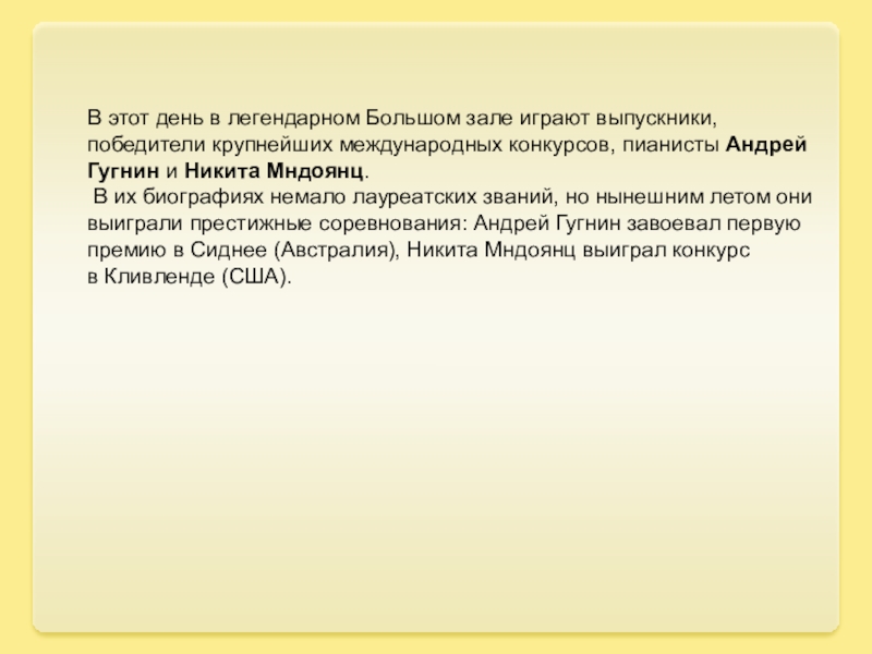 Слайд 17В этот день в легендарном Большом зале играют выпускники, победители крупнейших международных конкурсов,