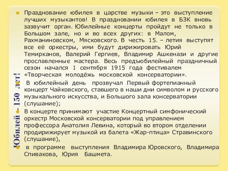лучших музыкантов! В праздновании юбилея в БЗК вновь зазвучит орган. Юбилейные концерты пройдут не только в Большом зале, но и во всех других: в Малом, Рахманиновском, Мясковского. В честь 15. – летия выступят все её оркестры, ими будут дирижировать Юрий Темирканов, Валерий Гергиев, Владимир Ашкенази и другие прославленные мастера. Весь предъюбилейный праздничный сезон начался 1 сентября 1915 года фестивалем «Творческая молодёжь московской консерватории».