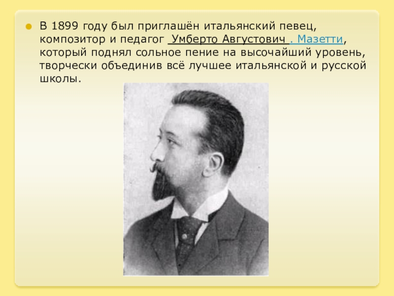 Слайд 7В 1899 году был приглашён итальянский певец, композитор и педагог Умберто