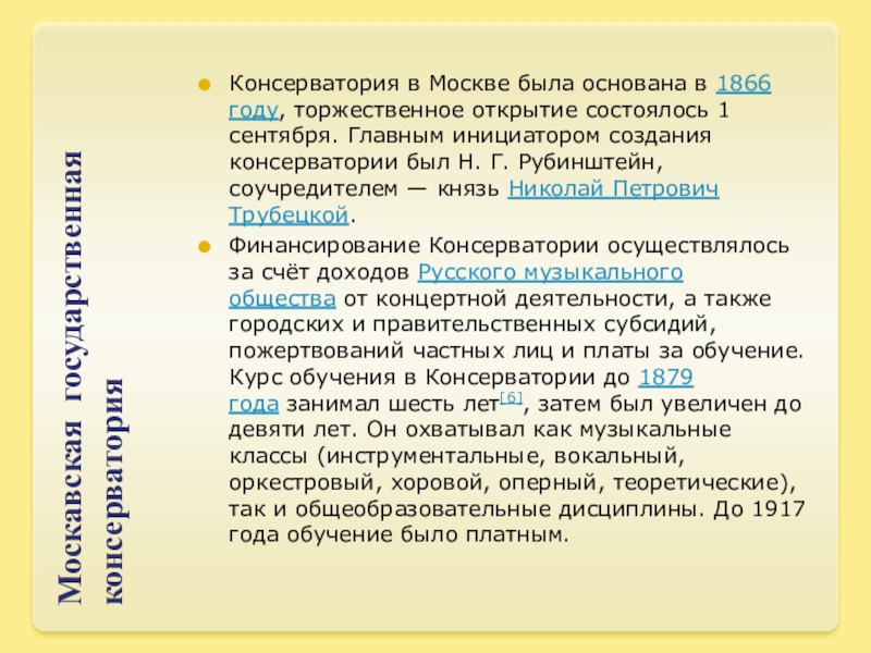 состоялось 1 сентября. Главным инициатором создания консерватории был Н. Г. Рубинштейн, соучредителем — князь Николай Петрович Трубецкой.