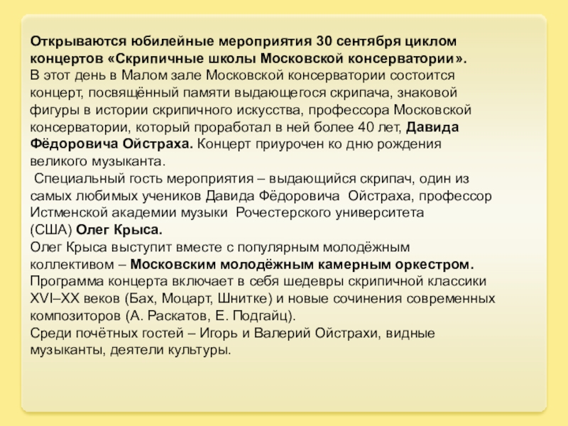 Слайд 19Открываются юбилейные мероприятия 30 сентября циклом концертов «Скрипичные школы Московской консерватории».