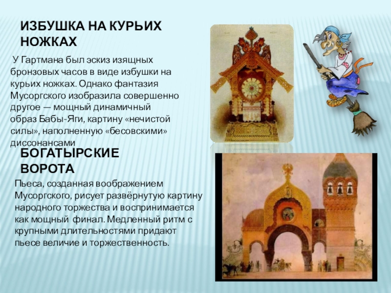 Пьеса, созданная воображением Мусоргского, рисует развёрнутую картину народного торжества и воспринимается как мощный финал. Медленный ритм с крупными длительностями придают пьесе величие и торжественность.