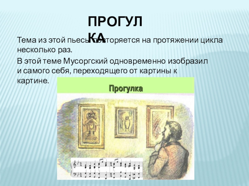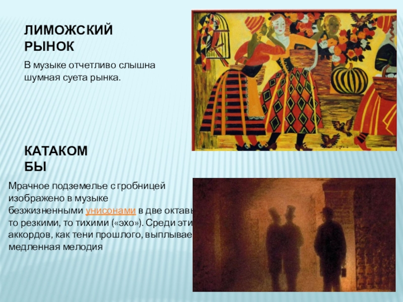 У Мусоргского звучит красивая протяжная меланхоличная мелодия — пометка гласит «очень певуче, скорбно», передающая тоску и тихую печаль.