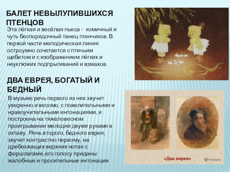 В музыке речь первого из них звучит уверенно и весомо, с повелительными и нравоучительными интонациями, и построена на тяжеловесном проигрывании мелодии двумя руками в октаву. Речь второго, бедного еврея, звучит контрастно первому, на дребезжащих верхних нотах с форшлагами, его голосу приданы жалобные и просительные интонации