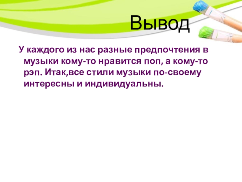каждого из нас разные предпочтения в музыки кому-то нравится поп, а кому-то рэп. Итак,все стили музыки по-своему интересны и индивидуальны.