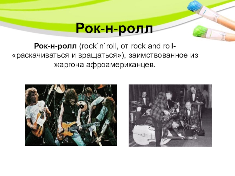 Рок-н-ролл Рок-н-ролл (rock`n`roll, от rock and roll- «раскачиваться и вращаться»), заимствованное из жаргона афроамериканцев.