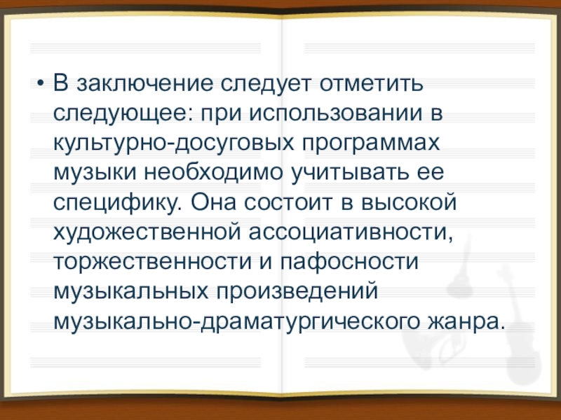 Слайд 7В заключение следует отметить следующее: при использовании в культурно-досуговых программах музыки