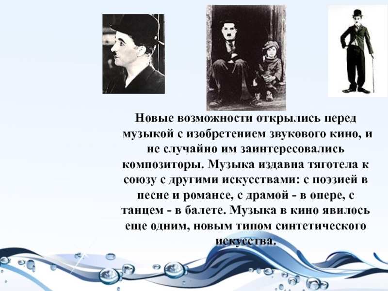 случайно им заинтересовались композиторы. Музыка издавна тяготела к союзу с другими искусствами: с поэзией в песне и романсе, с драмой - в опере, с танцем - в балете. Музыка в кино явилось еще одним, новым типом синтетического искусства.