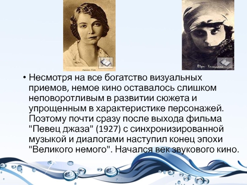 в развитии сюжета и упрощенным в характеристике персонажей. Поэтому почти сразу после выхода фильма "Певец джаза" (1927) с синхронизированной музыкой и диалогами наступил конец эпохи "Великого немого". Начался век звукового кино.
