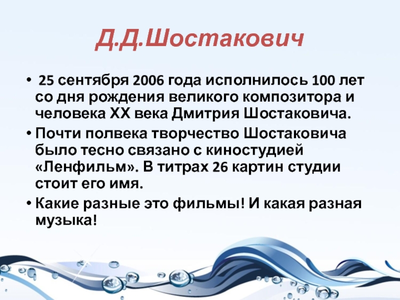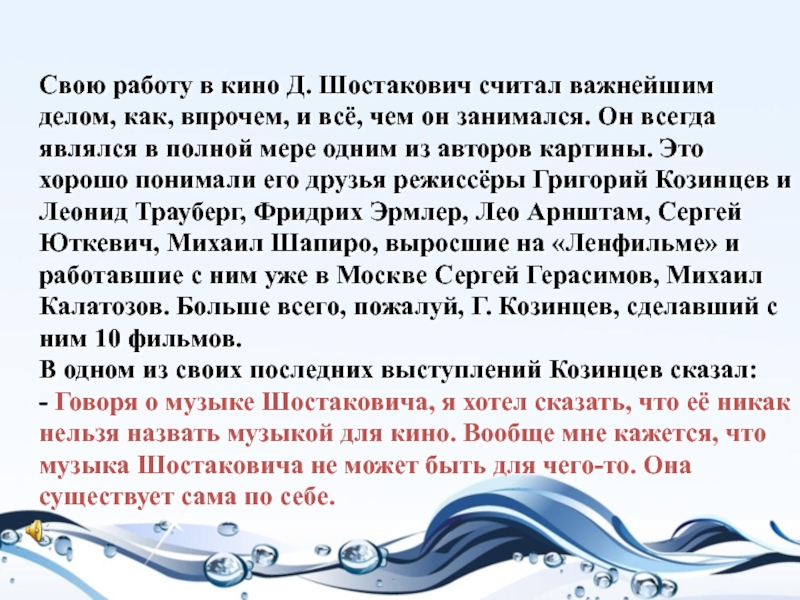 Слайд 12Свою работу в кино Д. Шостакович считал важнейшим делом, как, впрочем,