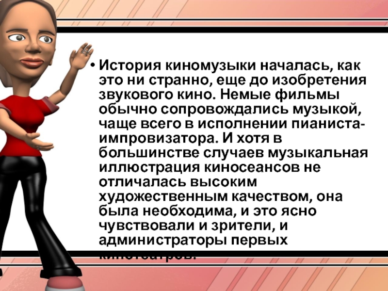 кино. Немые фильмы обычно сопровождались музыкой, чаще всего в исполнении пианиста-импровизатора. И хотя в большинстве случаев музыкальная иллюстрация киносеансов не отличалась высоким художественным качеством, она была необходима, и это ясно чувствовали и зрители, и администраторы первых кинотеатров.