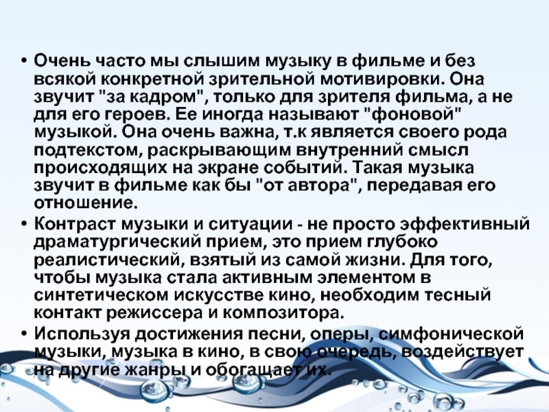 зрительной мотивировки. Она звучит "за кадром", только для зрителя фильма, а не для его героев. Ее иногда называют "фоновой" музыкой. Она очень важна, т.к является своего рода подтекстом, раскрывающим внутренний смысл происходящих на экране событий. Такая музыка звучит в фильме как бы "от автора", передавая его отношение.