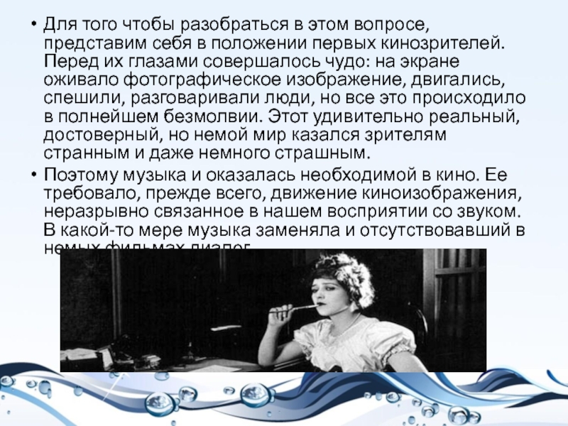 Поэтому музыка и оказалась необходимой в кино. Ее требовало, прежде всего, движение киноизображения, неразрывно связанное в нашем восприятии со звуком. В какой-то мере музыка заменяла и отсутствовавший в немых фильмах диалог.