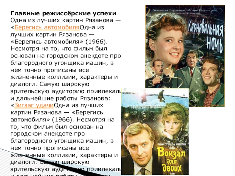 картин Рязанова — «Берегись автомобиля» (1966). Несмотря на то, что фильм был основан на городском анекдоте про благородного угонщика машин, в нём точно прописаны все жизненные коллизии, характеры и диалоги. Самую широкую зрительскую аудиторию привлекали и дальнейшие работы Рязанова: «Зигзаг удачиОдна из лучших картин Рязанова — «Берегись автомобиля» (1966). Несмотря на то, что фильм был основан на городском анекдоте про благородного угонщика машин, в нём точно прописаны все жизненные коллизии, характеры и диалоги. Самую широкую зрительскую аудиторию привлекали и дальнейшие работы Рязанова: «Зигзаг удачи», «Старики-разбойникиОдна из лучших картин Рязанова — «Берегись автомобиля» (1966). Несмотря на то, что фильм был основан на городском анекдоте про благородного угонщика машин, в нём точно прописаны все жизненные коллизии, характеры и диалоги. Самую широкую зрительскую аудиторию привлекали и дальнейшие работы Рязанова: «Зигзаг удачи», «Старики-разбойники», «Невероятные приключения итальянцев в РоссииОдна из лучших картин Рязанова — «Берегись автомобиля» (1966). Несмотря на то, что фильм был основан на городском анекдоте про благородного угонщика машин, в нём точно прописаны все жизненные коллизии, характеры и диалоги. Самую широкую зрительскую аудиторию привлекали и дальнейшие работы Рязанова: «Зигзаг удачи», «Старики-разбойники», «Невероятные приключения итальянцев в России» (1973), «Ирония судьбы, или С лёгким паром!Одна из лучших картин Рязанова — «Берегись автомобиля» (1966). Несмотря на то, что фильм был основан на городском анекдоте про благородного угонщика машин, в нём точно прописаны все жизненные коллизии, характеры и диалоги. Самую широкую зрительскую аудиторию привлекали и дальнейшие работы Рязанова: «Зигзаг удачи», «Старики-разбойники», «Невероятные приключения итальянцев в России» (1973), «Ирония судьбы, или С лёгким паром!» (1975, телефильм), «Служебный романОдна из лучших картин Рязанова — «Берегись автомобиля» (1966). Несмотря на то, что фильм был основан на городском анекдоте про благородного угонщика машин, в нём точно прописаны все жизненные коллизии, характеры и диалоги. Самую широкую зрительскую аудиторию привлекали и дальнейшие работы Рязанова: «Зигзаг удачи», «Старики-разбойники», «Невероятные приключения итальянцев в России» (1973), «Ирония судьбы, или С лёгким паром!» (1975, телефильм), «Служебный роман», «Вокзал для двоихОдна из лучших картин Рязанова — «Берегись автомобиля» (1966). Несмотря на то, что фильм был основан на городском анекдоте про благородного угонщика машин, в нём точно прописаны все жизненные коллизии, характеры и диалоги. Самую широкую зрительскую аудиторию привлекали и дальнейшие работы Рязанова: «Зигзаг удачи», «Старики-разбойники», «Невероятные приключения итальянцев в России» (1973), «Ирония судьбы, или С лёгким паром!» (1975, телефильм), «Служебный роман», «Вокзал для двоих», «Жестокий романсОдна из лучших картин Рязанова — «Берегись автомобиля» (1966). Несмотря на то, что фильм был основан на городском анекдоте про благородного угонщика машин, в нём точно прописаны все жизненные коллизии, характеры и диалоги. Самую широкую зрительскую аудиторию привлекали и дальнейшие работы Рязанова: «Зигзаг удачи», «Старики-разбойники», «Невероятные приключения итальянцев в России» (1973), «Ирония судьбы, или 