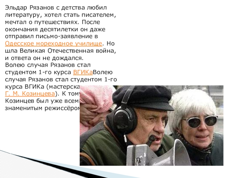 Волею случая Рязанов стал студентом 1-го курса ВГИКаВолею случая Рязанов стал студентом 1-го курса ВГИКа (мастерская Г. М. Козинцева). К тому времени Козинцев был уже всемирно знаменитым режиссёром.