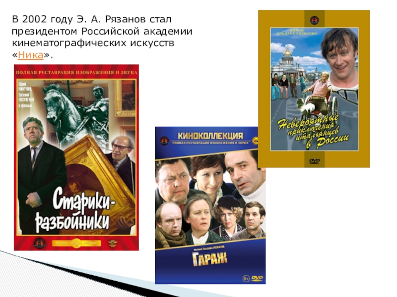 Слайд 6В 2002 году Э. А. Рязанов стал президентом Российской академии кинематографических искусств «Ника».