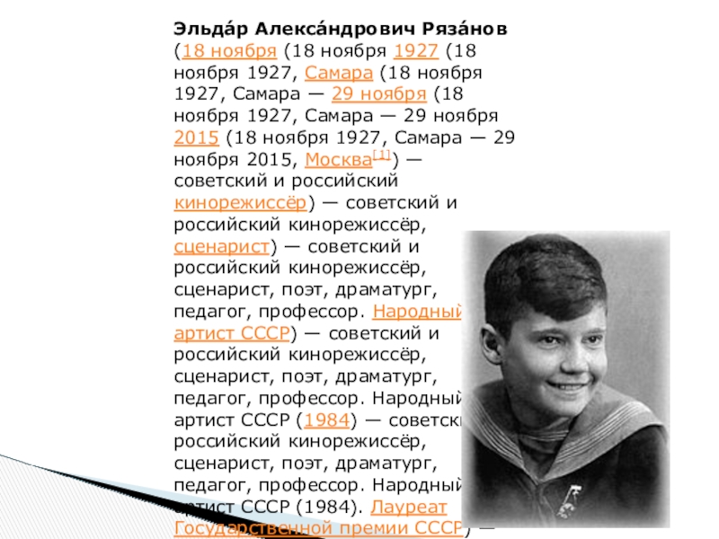 Слайд 2Эльда́р Алекса́ндрович Ряза́нов (18 ноября (18 ноября 1927 (18 ноября 1927,
