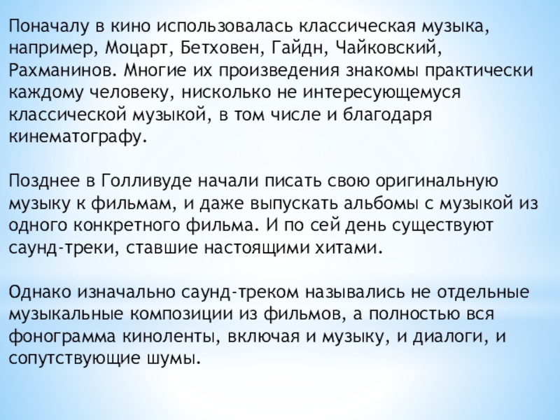 Слайд 11Поначалу в кино использовалась классическая музыка, например, Моцарт, Бетховен, Гайдн, Чайковский,