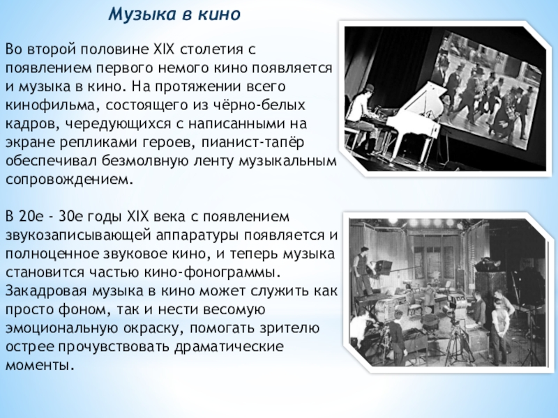 В 20е - 30е годы XIX века с появлением звукозаписывающей аппаратуры появляется и полноценное звуковое кино, и теперь музыка становится частью кино-фонограммы. Закадровая музыка в кино может служить как просто фоном, так и нести весомую эмоциональную окраску, помогать зрителю острее прочувствовать драматические моменты.