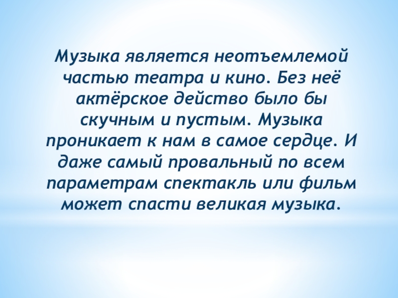 Слайд 13Музыка является неотъемлемой частью театра и кино. Без неё актёрское действо