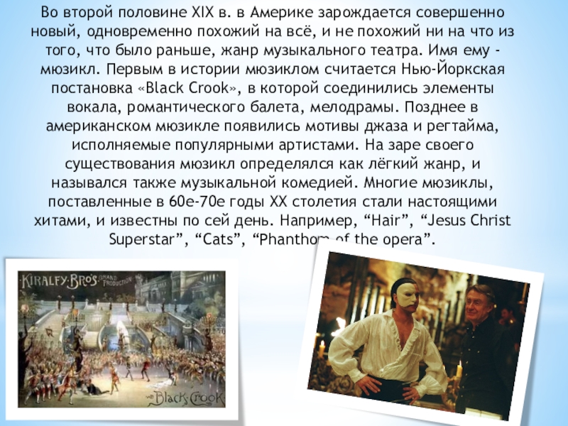 похожий на всё, и не похожий ни на что из того, что было раньше, жанр музыкального театра. Имя ему - мюзикл. Первым в истории мюзиклом считается Нью-Йоркская постановка «Black Crook», в которой соединились элементы вокала, романтического балета, мелодрамы. Позднее в американском мюзикле появились мотивы джаза и регтайма, исполняемые популярными артистами. На заре своего существования мюзикл определялся как лёгкий жанр, и назывался также музыкальной комедией. Многие мюзиклы, поставленные в 60е-70е годы XX столетия стали настоящими хитами, и известны по сей день. Например, “Hair”, “Jesus Christ Superstar”, “Cats”, “Phanthom of the opera”.