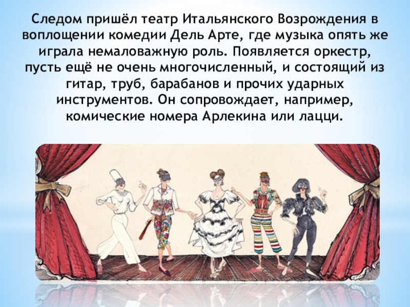 Слайд 4Следом пришёл театр Итальянского Возрождения в воплощении комедии Дель Арте, где
