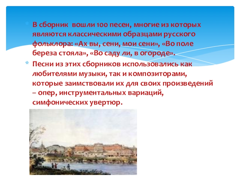 Песни из этих сборников использовались как любителями музыки, так и композиторами, которые заимствовали их для своих произведений – опер, инструментальных вариаций, симфонических увертюр.