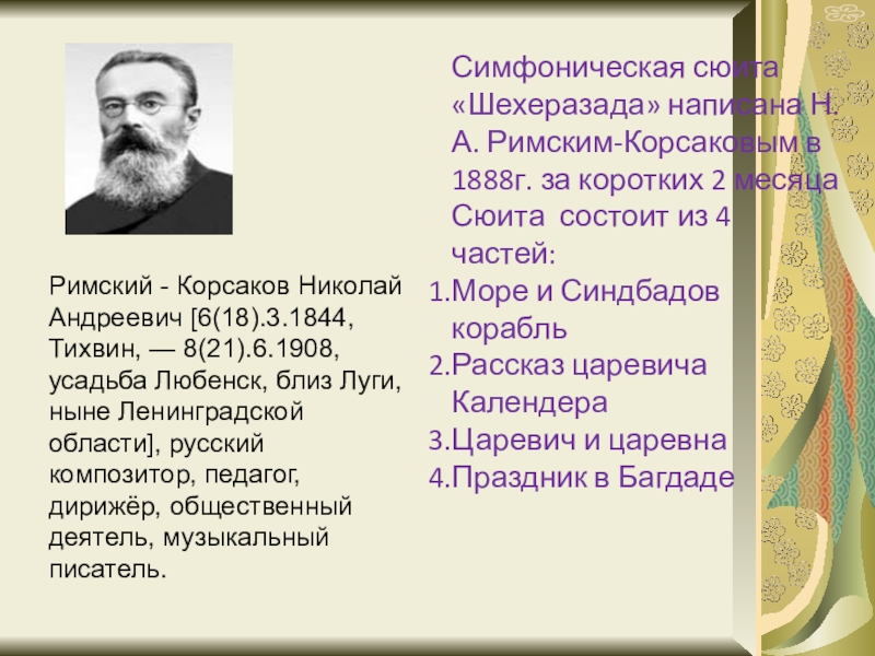 Римский - Корсаков Николай Андреевич [6(18).3.1844, Тихвин, — 8(21).6.1908, усадьба Любенск, близ Луги, ныне Ленинградской области], русский композитор, педагог, дирижёр, общественный деятель, музыкальный писатель.